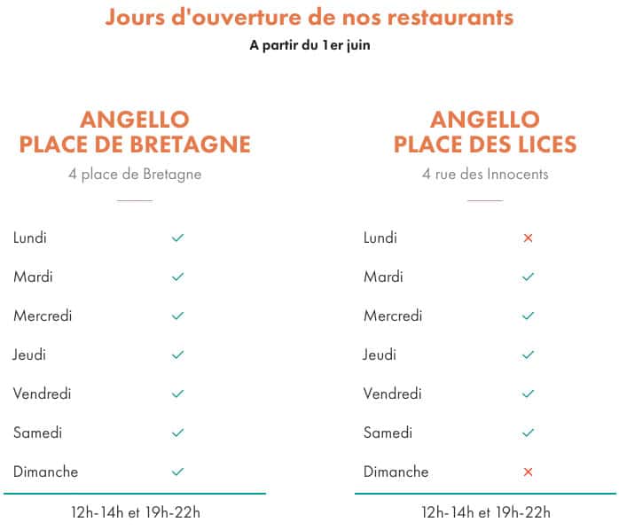 * Angello – 4, Place de Bretagne, 35000 Rennes : réserver en ligne ou contacter le 06.74.74.74.89 – Ouverts 7/7 de 12h00 à 14h00 et de 19h00 à 22h00.